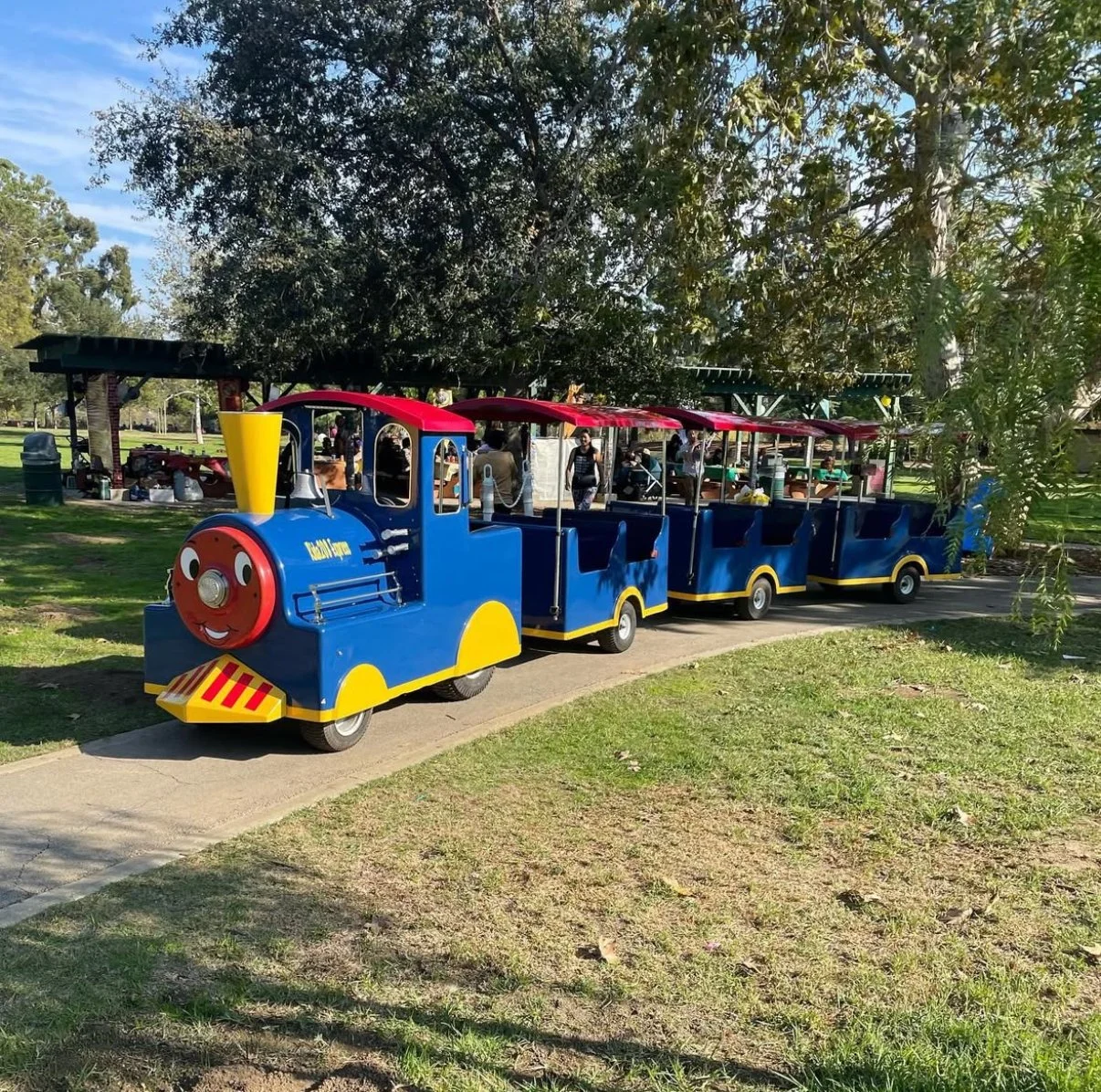 A small blue train with a cartoon face on the front, yellow accents, and red roofs on the seats, located on a paved path in a park with trees and people in the background.