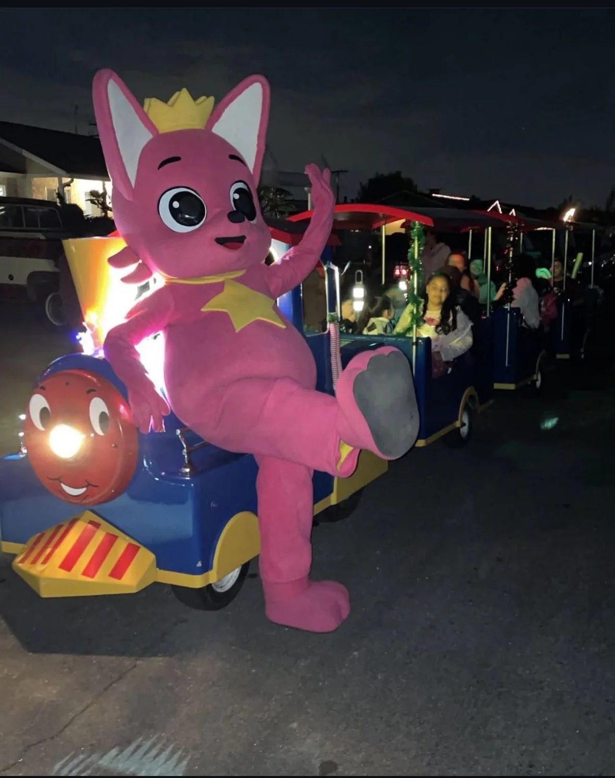 A person in a pink animal mascot costume, with a yellow crown and star on its chest, sitting on a small train with children in a parade or festival setting at night.